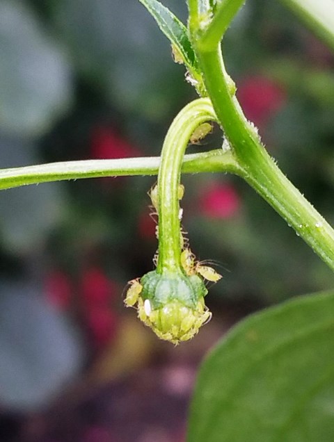 The answer to this problem is that as soon as you see evidence of greenfly, usually the feathery white skins on the leaves below, check your flowers. It is difficult to get at the greenfly inside and crush them without damaging the flowers, so you can use an organic spray, but I think it is best to nip off the flowers while they are young so the plant doesn’t waste its resources growing useless fruit. It will soon grow more flowers,usually they produce many more flowers than fruit anyway, and it ensures you get rid of your greenfly and leave the plant producing a healthy crop.